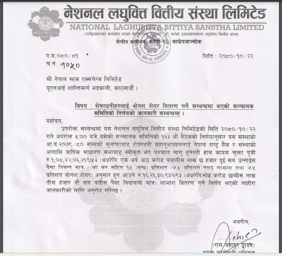 नेशनल लघुवित्त वित्तीय संस्था लिमीटेडले लाभांश घोषणा गरेको छ ।