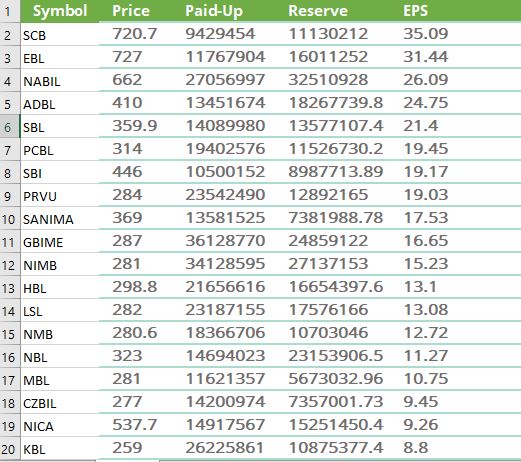 ईपियसका आधारमा राम्रा पाच बैंकहरु हेर्दा स्ट्यान्डर्ड चार्टर्ड बैंक, एभरेस्ट बैंक , नबिल बैंक, कृषि बिकास बैंक र सिद्धार्थ बैंक रहेको देखिन्छ ।