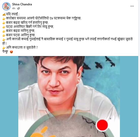 “पोर्टफोलियो १७ पटक चेक गर्ने लगानीकर्ता होइन, जुवाडे हुन्!” — शिभ चन्द्रको कडा सन्देश