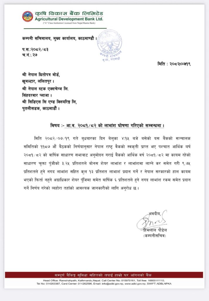 काठमाडौं । कृषि विकास बैंक लिमिटेडले आर्थिक वर्ष २०८१/८२ को मुनाफाबाट सेयरधनीहरूलाई कुल १३ प्रतिशत लाभांश वितरण गर्ने निर्णय गरेको छ ।